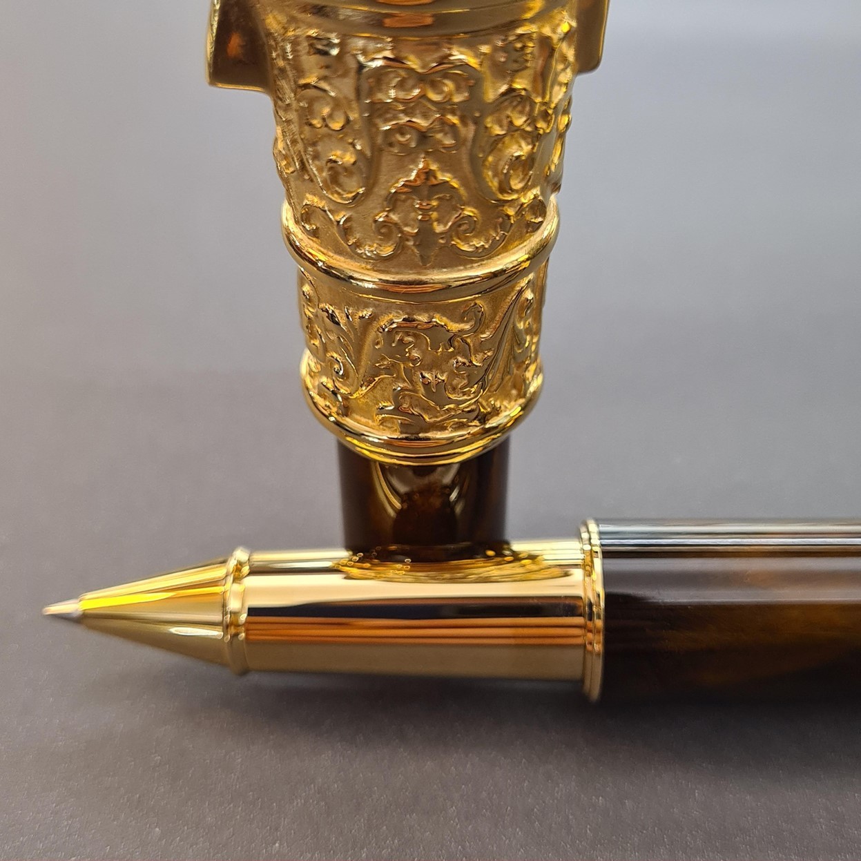 Roller, Les instruments d'écriture, Roller, Les instruments d’écriture d'occasions et vintageBien que les pirates aient existé tout au long de l'histoire et existent toujours, l'âge d'or du pirate traditionnellement représenté dans les médias était de 1620 à 1720. Les pirates ont abondé pendant cette ère en raison des vastes richesses transportées du Nouveau Monde. Ils sont bien connus pour leurs chasses au trésor en utilisant des cartes et des boussoles et pour leurs combats avec des fusils et des canons. La Maison Dupont, en collaboration avec 2Saints, transforme la splendeur exquise du canon des pirates en instruments d'écriture sculptés à la main. Façonné à partir de bronze avec des finitions en or jaune Laque "popoté" marron Ce roller peut-être également équipé de recharges feutre. Edition limité N°007/288 pièces. Modèle jamais utilisé, neuf. Ecrins et documents d’origine3200€ 2667€TVA -