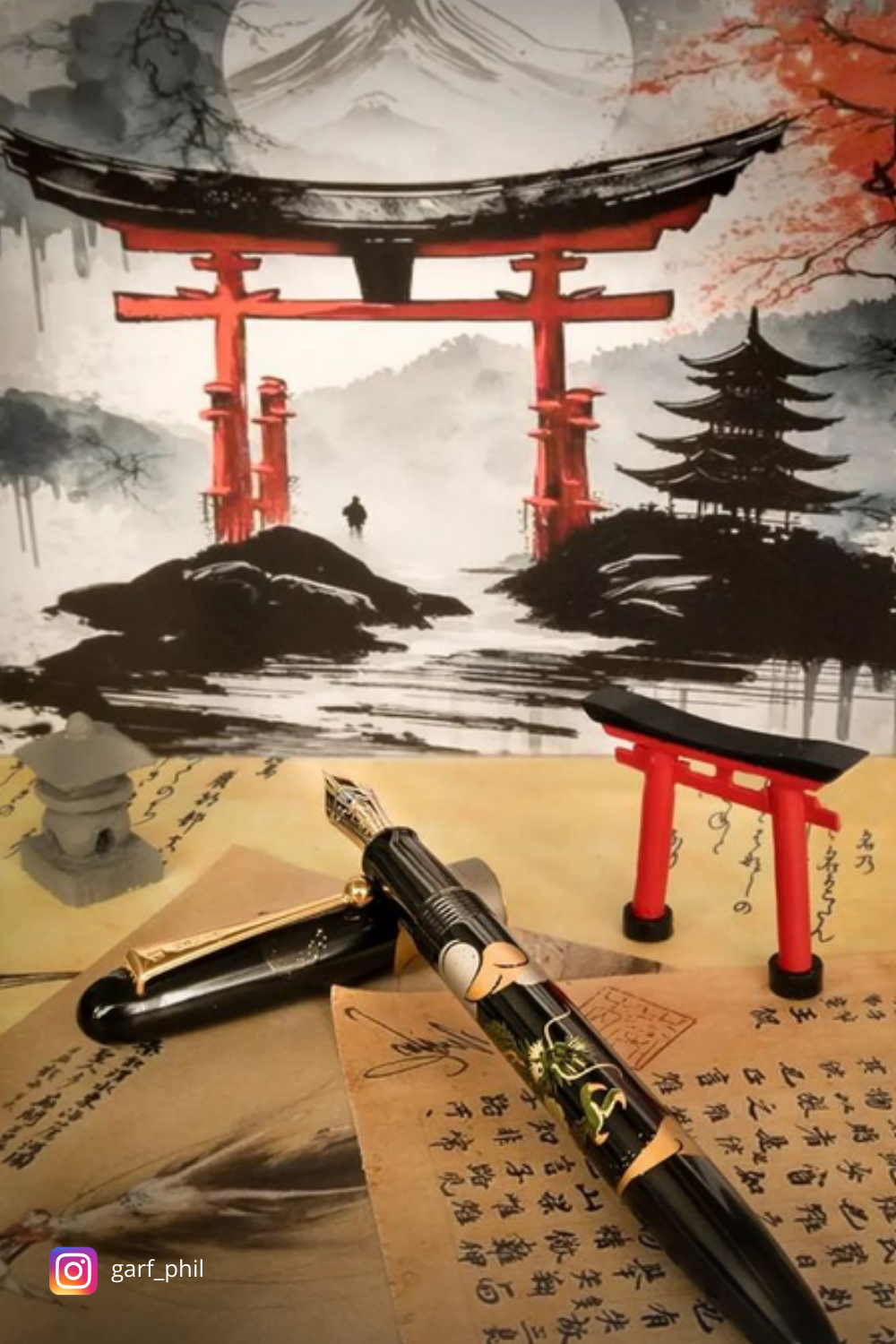 Participer au concours photo m’a permis de conjuguer ma passion pour la photo et mon plaisir de mettre en valeur mon stylo. Il y a eu de très nombreux essais. Le fond a beaucoup changé, depuis des BD sur les samouraïs vers des posters qui décorent mon bureau. J’ai essayé d’ajouter de la fumée avec de l’encens pour figurer les nuages du stylo et une ambiance mystique… sans succès ! Ensuite, il fallait positionner correctement le stylo : en entier ? Gros plan sur la plume ? De gauche à droite ou inversement? Etc. Simultanément, je fabriquais un support en bois pour la bouteille d’encre et le stylo le faisant reposer sur deux torii en bois associés à une lanterne japonaise. Les torii ont été fabriquées selon les plans et dimensions trouvés dans un ouvrage japonais et la couleur rouge a également fait l’objet de multiples tentatives pour correspondre exactement à la réalité. Quant à la lanterne, elle est sculptée dans du bouleau et peinte avec des grains de bicarbonate de soude pour simuler le ciment. Il ne restait plus qu’à rassembler harmonieusement tous ces éléments, gérer la lumière pour éviter toute ombre disgracieuse et limiter la profondeur de champ pour mettre la plume en valeur. Et voilà !