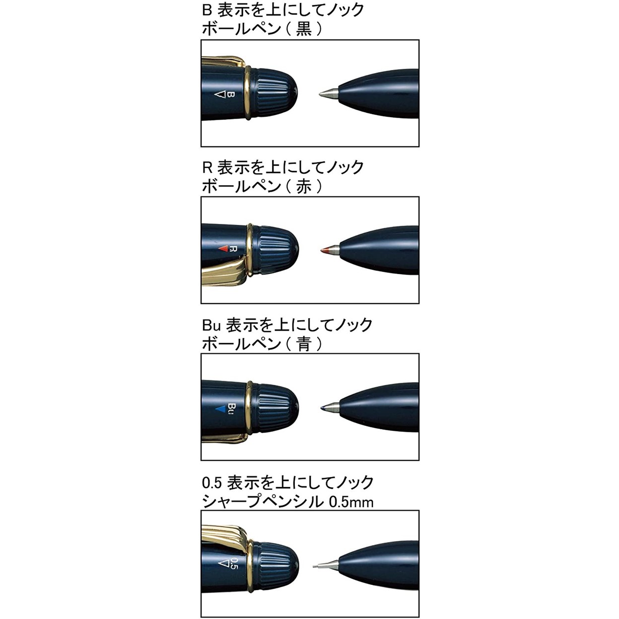 Caractéristiques : trois couleurs de stylo bille (noir, bleu et rouge) que vous pouvez changer contre les couleurs de votre choix, et un portemine au diamètre 0,5 mm. En se positionnant face aux indices « R » pour red, « B » pour black, « Bu » pour bleu et « 0,5 » pour le portemine, vous actionnez la fonction en appuyant sur le haut du capuchon. Pour remplacer les recharges, il suffit de dévisser l’embout du corps. Recharges bille courtes de type Parker, Montblanc ou Lamy. Multifonction en métal laqué mat noir et attributs noir.