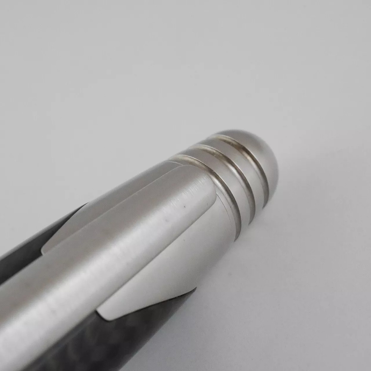 Le corps et le capuchon sont magnifiques, avec un superbe tissage en fibre de carbone et des attributs argent mat.