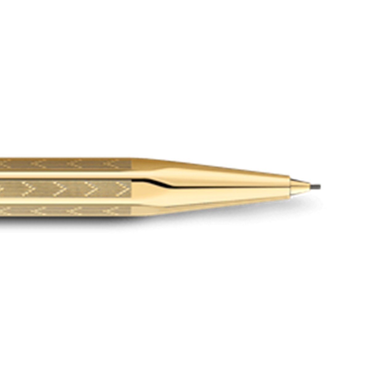 Intemporel. L'Ecridor™ Chevron arbore sur les six faces de son corps doré un motif en forme de V inversé. Ces chevrons gravés au diamant répondent élégamment à ses attributs dorés. Le porte-mine Ecridor™ Chevron est équipé d’un mécanisme de haute précision. Vous apprécierez la qualité des mines Graphite 0,7 mm et le confort de la gomme remplaçable placée sous le bouton poussoir. Détails techniques VERSION D'INSTRUMENT D'ÉCRITURE Porte-Mine Longueur : 131 mm & Diamètre : 8 mm CORPS DU STYLO Corps hexagonal en laiton, finition dorée Guillochage au diamant Motif en forme de V inversé Mécanisme bouton-poussoir et clip flexible dorés Isotype hexagonal et logo Caran d’Ache gravés sur le bouton Gomme incluse sous le bouton CARTOUCHES ET RECHARGES Équipé d'une mine de diamètre 0.7 mm Recharges : mines graphite 0.7 mm et gommes de rechange PACKAGING Écrin standard Dimensions : 18.4 x 8 x 4 cm Poids : 0.242 kg NORMES LÉGALES Swiss Made RÉFÉRENCE DU PRODUIT Réf. 4.208