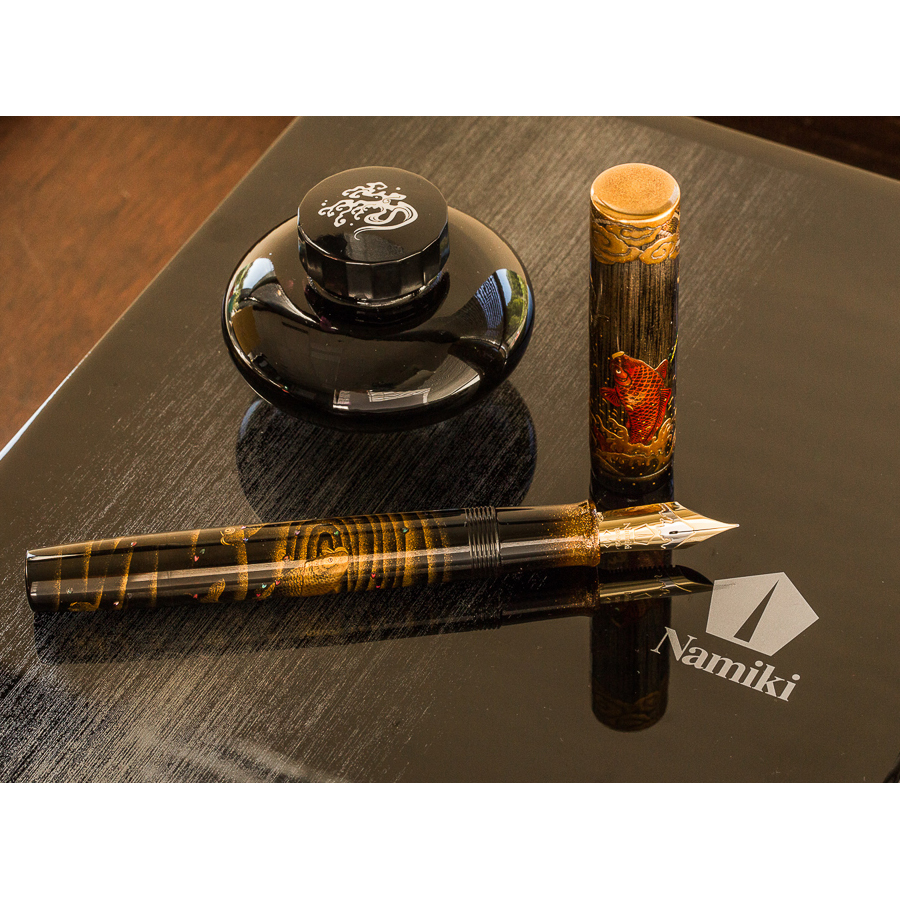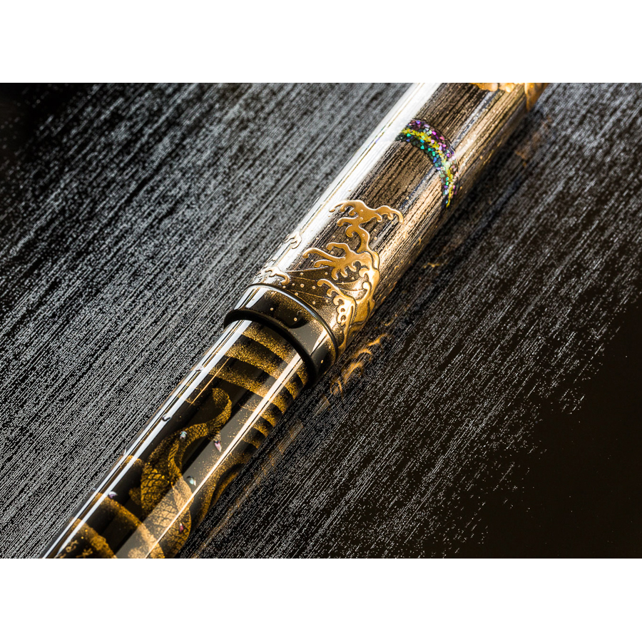 Série limitée de l’année 2017 réalisé sur la base d’un stylo plume Empereur, le plus grand modèle Namiki, en ébonite revêtue de laque japonaise urushi*, ici dans la version Flat top (embouts plats). Réalisée par l’artiste japonais Masahiro, l’édition Toryumon est limitée à 99 pièces numérotées. Depuis la nuit des temps, les rapides du canyon qui traverse les montagnes du Fleuve Jaune en Chine sont appelés « Longmen », la Porte du Dragon. Selon la légende, une carpe aurait remonté ces rapides, se serait transformée en dragon puis envolée dans les airs. Cette histoire a donné naissance à l’expression « Remontée de la Porte du Dragon », qui se dit Toryumon en japonais. Encore aujourd’hui, ce conte largement diffusé est devenu le symbole du dépassement, du courage face à l’adversité. Sur le corps du stylo plume, les carpes n’ayant pas encore remonté les rapides, nagent en eau tranquille, illustrées par les techniques de Togidashi maki-e* et Taka maki-e. Les pétales de fleurs de cerisier qui flottent à la surface luisante de l’eau ainsi qu’un magnifique arc-en-ciel sont subtilement mis en valeur par des incrustations de nacre grâce à la technique de Raden* ; les ondulations causées par le mouvement des carpes sont elles rehaussées de poudre d’or suivant la technique de Togidashi maki-e. Les deux carpes présentes sur le capuchon sont le théâtre de leurs efforts intenses pour remonter les rapides. Elles commencent à se transformer en dragons et sont intensément mises en valeur par la techinique du Taka-makie. Au-dessus de l’arc-en-ciel, le corps d’un dragon en partie masqué par d’épais nuages, évoque la réussite de la carpe qui, ayant remonté les rapides, s’est transformée en un éblouissant dragon s’envolant vers le ciel. Plume en or bicolore 18 carats n° 50, système de remplissage au compte-gouttes. Grande contenance d’encre dans le réservoir.