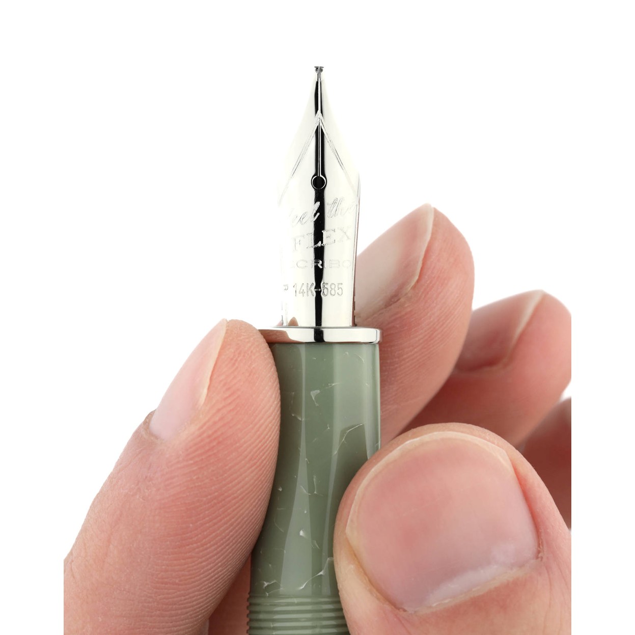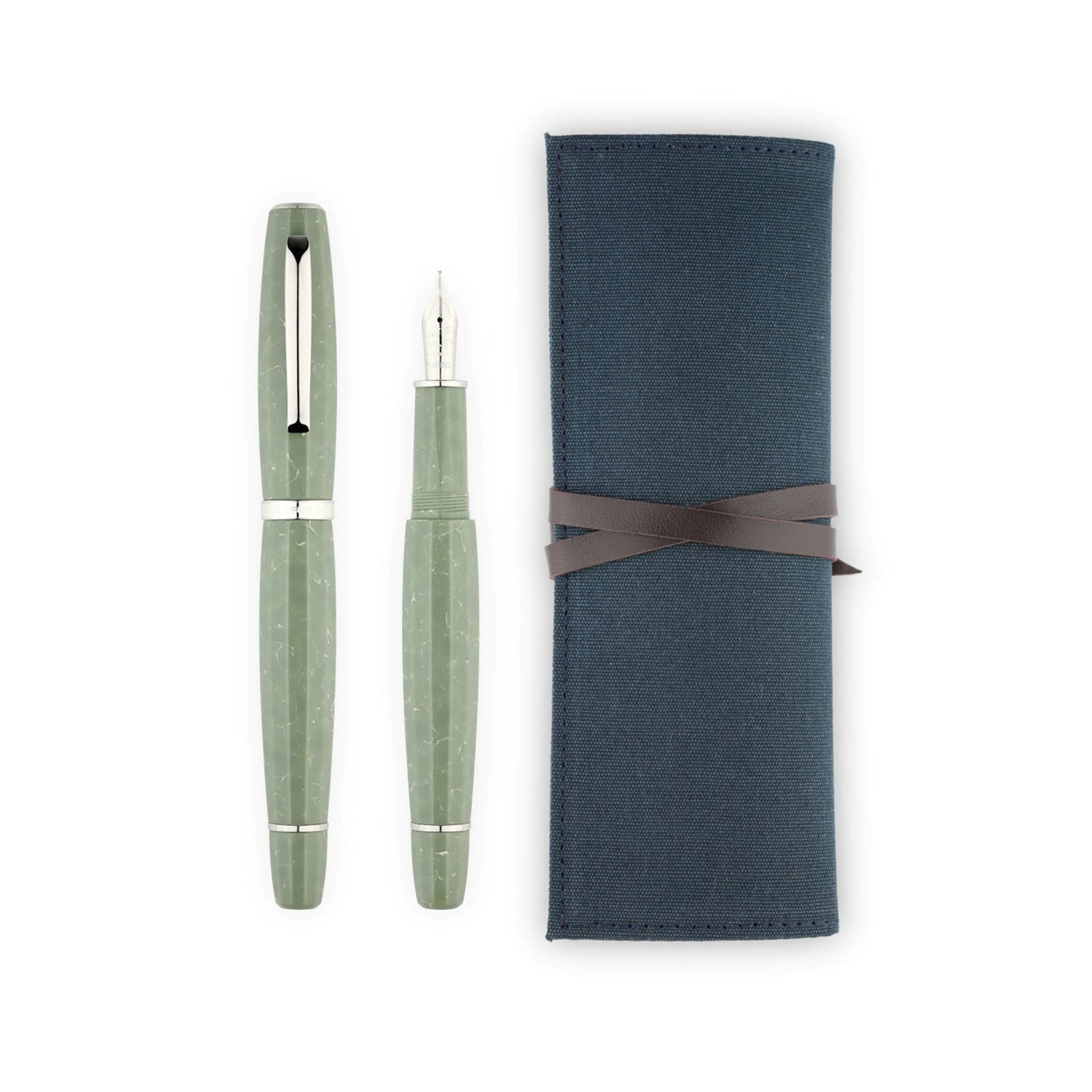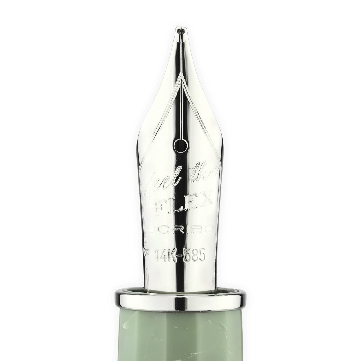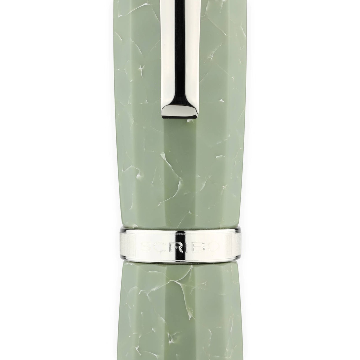 La nouvelle teinte FEEL Verde Antico s'inspire des effets de matière et des couleurs de la fin du XIXe siècle. Le vert, couleur omniprésente en peinture, en céramique et en verre durant la même période historique qui vit naître le mouvement artistique connu sous le nom d'Art nouveau (entre la fin du XIXe et le début du XXe siècle), est à l'honneur avec notre stylo FEEL Verde Antico. Des attributs en platine viennent sublimer les nuances plus claires du corps. Le Verde Antico (vert vintage) est obtenu en combinant du bleu avec du jaune désaturé et une composante grise importante. C'est une teinte douce, entre aquatique et sauvage, qui évoque fortement la nature et transmet sérénité et harmonie. Le colorie Verde Antico est produit à 219 exemplaires. Ressentez l'écriture. RESSENTEZ. Caractéristiques du produit : – Forme dodécagonale – Couleur : vert vintage avec des stries gris clair – Capuchon, corps, bouton et porte-plume fabriqués à la main en résine – Clip et composants métalliques avec finitions en platine – Longueur : 148 mm – Diamètre maximal : 17 mm – Plume exclusive SCRIBO en or 14 carats extra-fine flexible – Conduit en ébonite ø 6,50 avec 2 capillaire – Capacité : 1,42 ml – Coffret de collection en cuir naturel et coton – Édition limitée à 219 exemplaires Si vous désirez une autres tailles de plume n’hésitez pas à nous appeler ou à nous envoyer un email : Tailles disponibles pour la plume 18 carats : Extra Extra Fine, Extra Fine, Fine, Medium, Broad, BB, BBB et Stub et tailles disponibles pour la plume 14 carats flexible : Extra Fine, Fine, Medium et Broad.