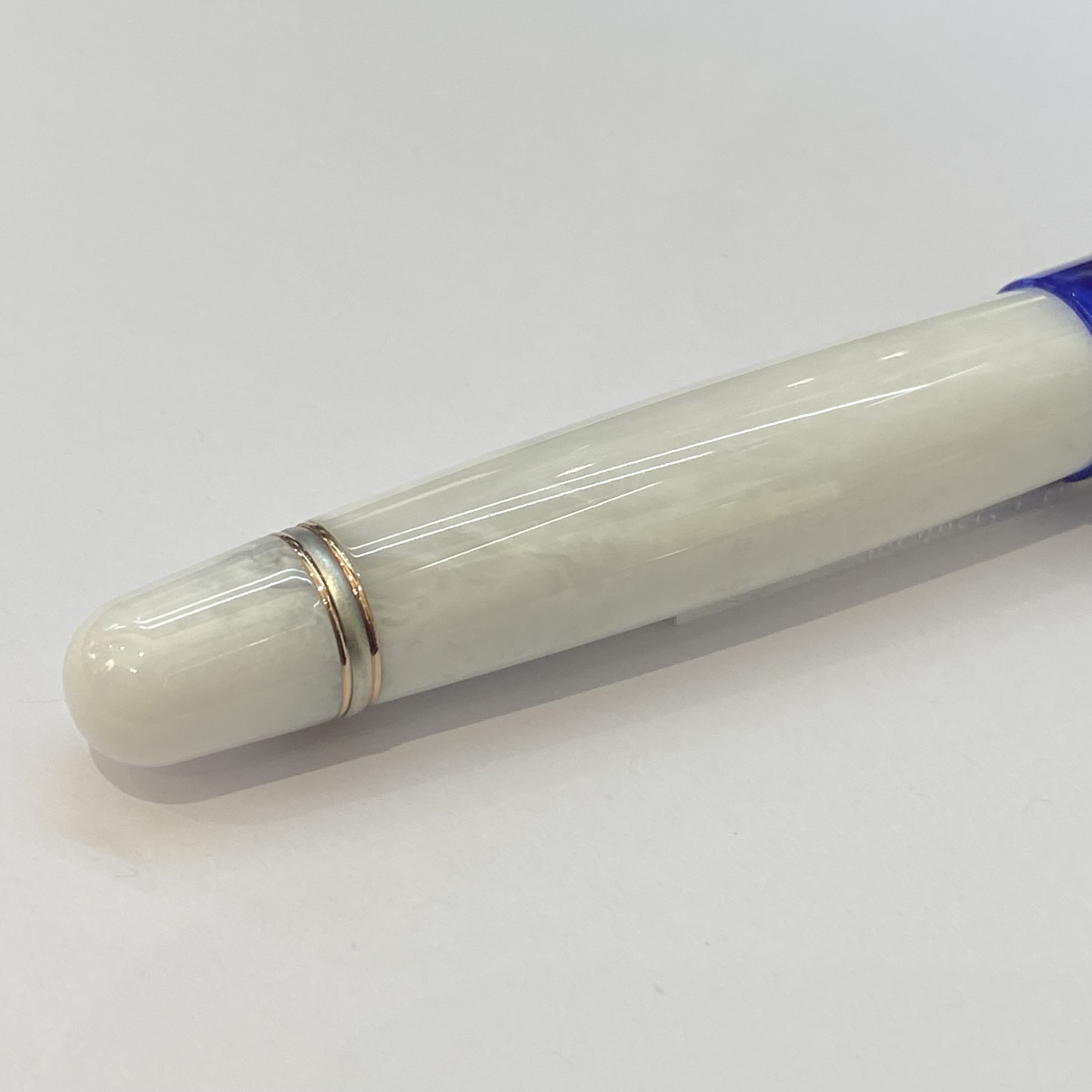 Stylo Plume en résine bleu et blanche, bague et agaphe en argent massif. Agraphe ornée d’une branche d’olivier, sur la bague vous trouverez l’étoile de David. Plume en 14k. Système à pompe et cartouche. Pour la taille de la plume n’hésitez pas à nous contacter. Edition Limitée à 10 pièces seulement!