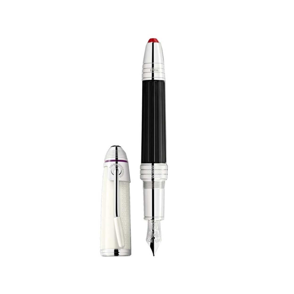 Le capuchon en résine précieuse blanc cassé est gravé d’un motif évoquant les sangles de guitare emblématiques portées par Hendrix. Le corps noir, en résine précieuse, est orné d’un élégant motif rappelant une pédale wah-wah, un outil indissociable de son style musical révolutionnaire.