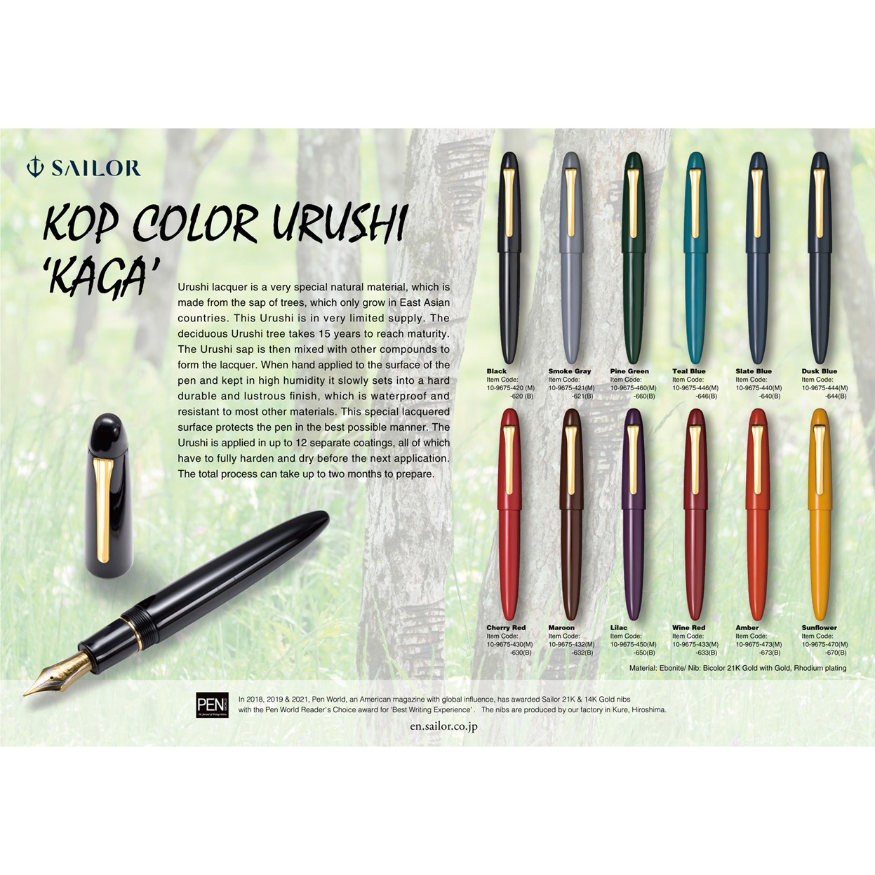 Le stylo-plume Sunflower surdimensionné « King of Pen » de Sailor est présenté comme le haut de gamme, développé comme le symbole de la technologie, de la qualité et de la perfection de l’écriture de Sailor, acquise après 100 ans d’expérience. Une attention particulière a été accordée à la plume surdimensionnée en or massif 21K (la vie et l’âme du stylo-plume), qui confère une qualité d’écriture exceptionnelle. Les stylos Sailor King de Pen Kaga Urushi sont fabriqués à la main en caoutchouc dur ébonite et finis à la main en laque naturelle urushi. Chaque stylo peut nécessiter jusqu’à un an ou plus pour être fabriqué. Ce stylo utilise le système de conversion de cartouche Sailor très pratique – il peut être rempli de toute encre de stylo-plume en bouteille lorsqu’il est équipé du convertisseur fourni et peut également utiliser des cartouches d’encre jetables de marque Sailor. Chaque stylo est expédié dans une boîte de présentation en bois de style traditionnel comprenant une bouteille d’encre. – Edition : Ebonite – Laque Urushi Sunflower- Attributs doré – Plume : Or 21 carats, plusieurs tailles – Poids : 40 grammes – Dimensions : 15,5 cm (fermé)