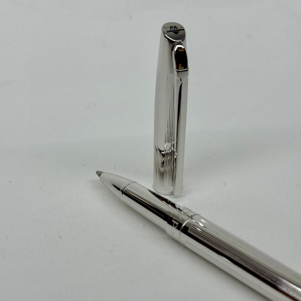 Corps avec parties lignées. Bague centrale avec inscription Caran d’Ache. Inscription PA sur le haut du capuchon.