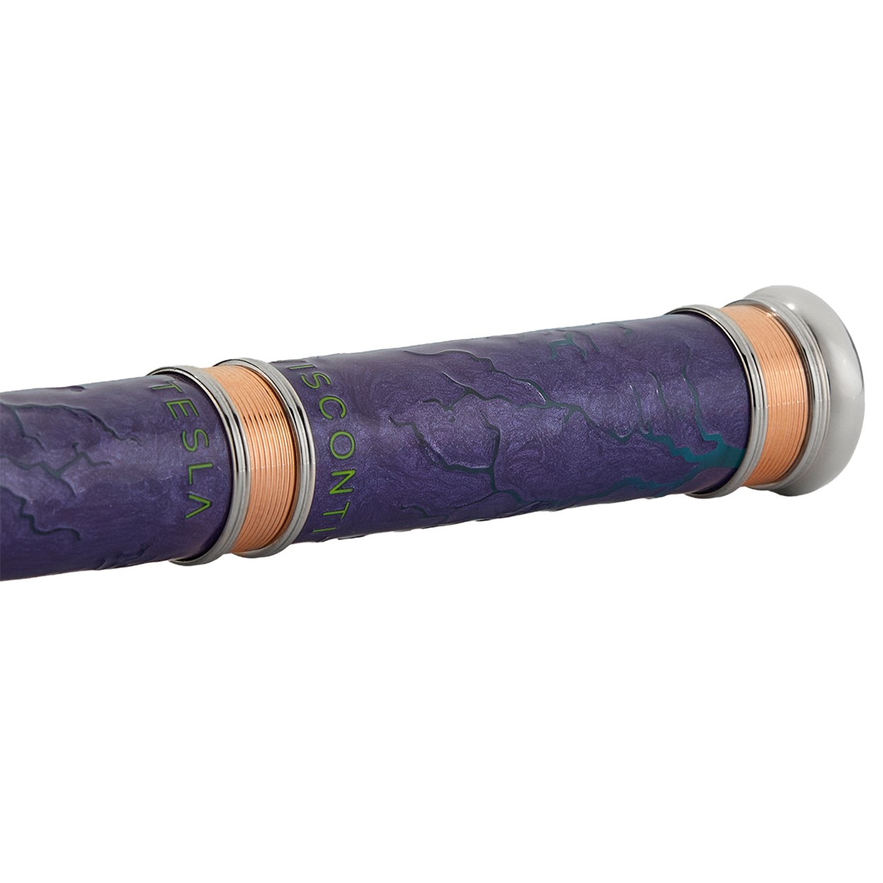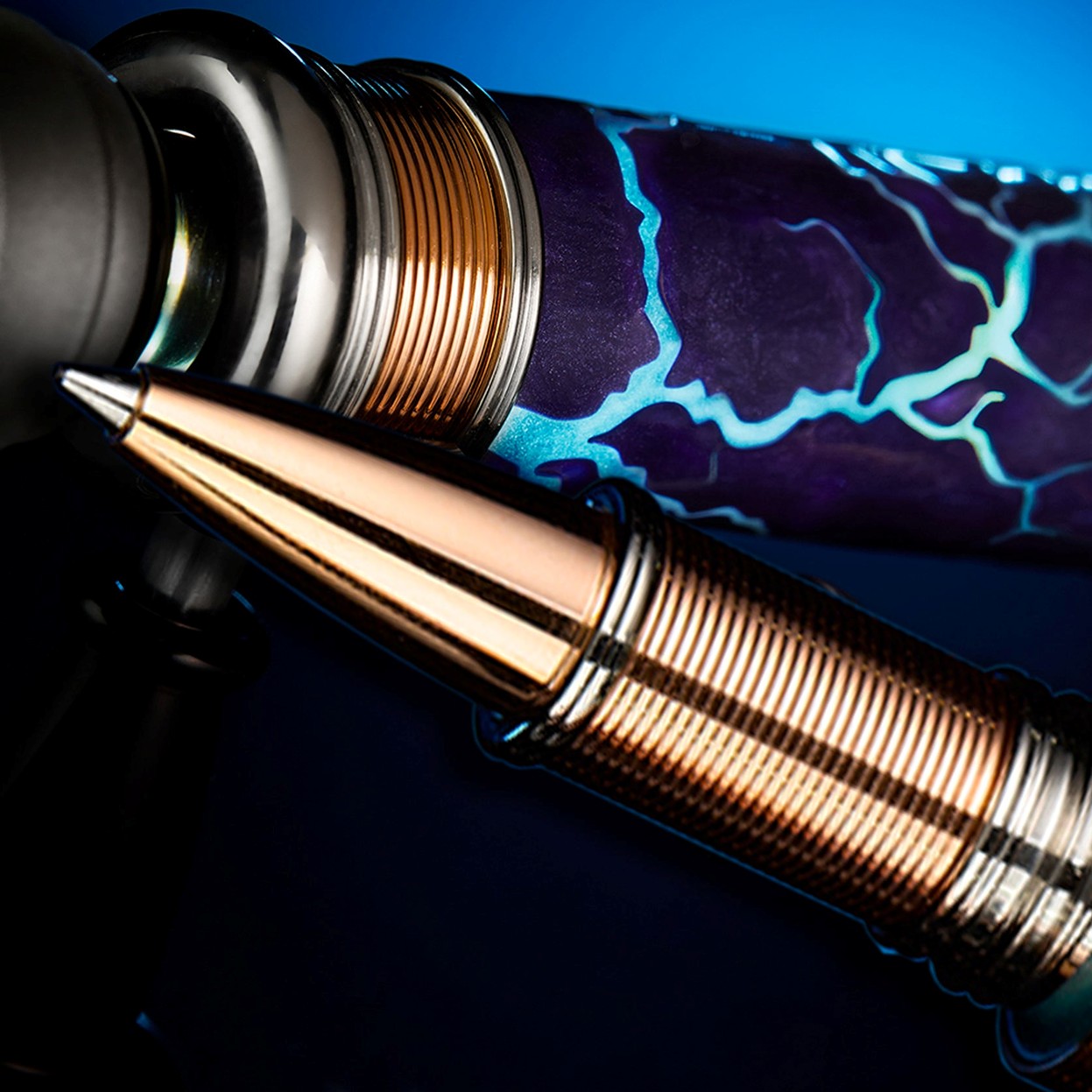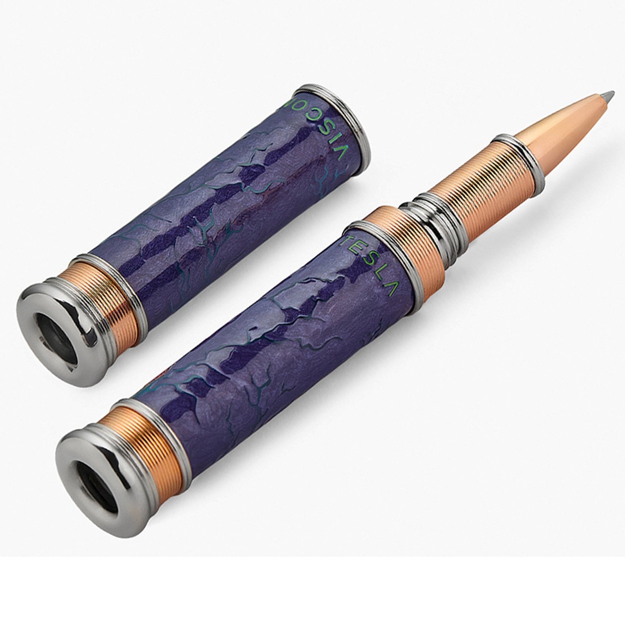 Son corps cylindrique aux extrémités toroïdales évoque les emblématiques bobines Tesla, tandis que les spirales plaquées or rose et les accents de palladium dynamisent le design. Les motifs d’éclairs gravés, rehaussés d’émail violet métallisé, créent une illusion d’optique, apparaissant et disparaissant au gré de la lumière. Édité à seulement 88 exemplaires dans le monde , ce stylo est bien plus qu’un simple instrument d’écriture : c’est une véritable pièce de collection.