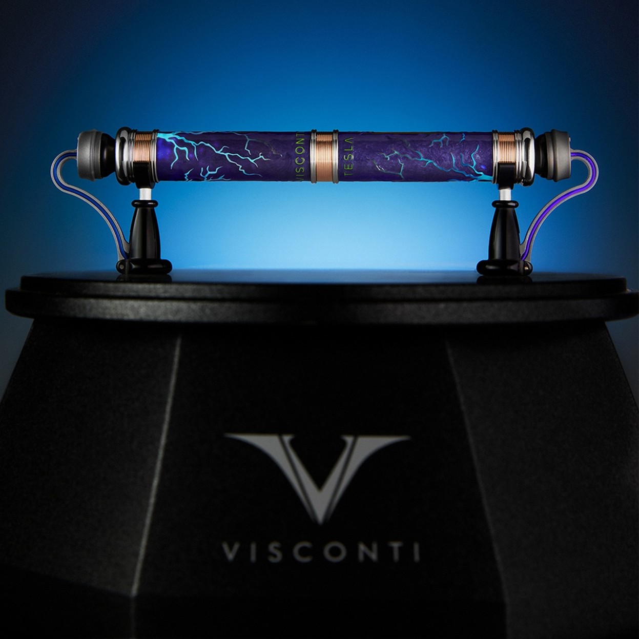 La fonction du stylo en roller est équipé d’une recharge internationale roller ou feutre, cela offre une expérience d’écriture d’une fluidité exceptionnelle. Placé sur son support sur mesure inspiré de la tour Tesla, le stylo s’illumine d’une lueur bleu glacé, révélant des éclairs de plasma dissimulés et transformant votre bureau en une œuvre d’art scientifique.