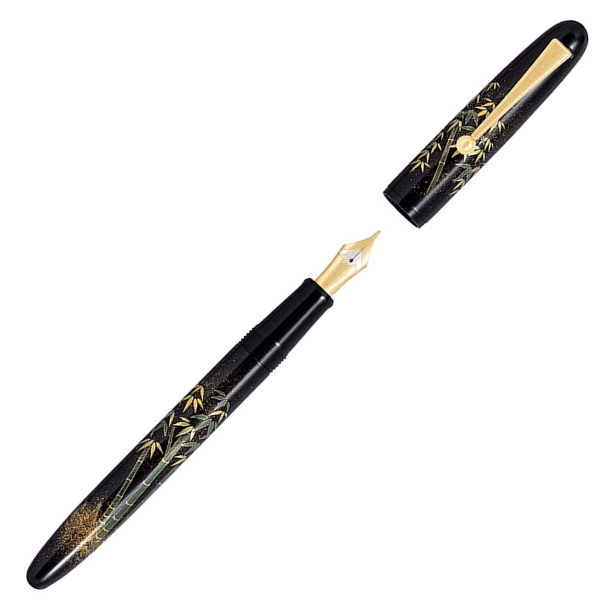 Les instruments d'écriture, PlumeDessin 2009 de la collection Yukari, en laque japonaise urushi peint à main levée, représentant « Des tiges de Bambou » emblème de longévité, sur un fond en laque noire, roiro. Ce n'est qu'au VIè siècle, pendant le règne de l'empereur Shomu, que l'art de la laque va connaître une véritable révolution avec la technique du maki-é. Techniques de maki-é utilisées : Hira maki-é de poudre d'or et d'argent, Togidashi-maki-é. Symbole de souplesse et de permanence par la persistance de son feuillage, le bambou matérialise la droiture morale et est associé à la rectitude du lettré. Associé au pin et au prunus, il est l'un des "trois amis de l'hiver". C'est un symbole de longue vie et de constance. "Au Japon, le bambou est considéré comme un matériau merveilleux. Comme il pousse partout, croît rapidement et se travaille comme le bois, il accompagne la vie quotidienne des Japonais depuis les temps les plus reculés. Si au Japon, le bambou est la plante à tout faire, il présente en plus la remarquable qualité d'être le support de l'esprit. Le peintre le définit comme le symbole parfait de la beauté ; le jardinier le façonne en haies et en barrières pour sacraliser les espaces ; le guerrier y puise la philosophie de "l'arc et la flèche"; le maître de thé, la simplicité rustique de son art.. Aucune bague ne vient troubler l'harmonie du dessin entre le capuchon et le corps du stylo. Plume en or jaune 18 carats, système de remplissage mixte à cartouche ou convertor, capuchon vissant. Symbole de l'école Kokkokai, pictogramme dont chaque lettre évoque les fondements traditionnels de la célèbre institution (la nation, la lumière et le groupe) peint sur le corps du stylo. Maki-é, mot à mot "peindre en semant de l'or" est une technique très ingénieuse en ce qu'elle tire partie des deux propriétés, adhésive et couvrante, de l'urushi. Elle consiste à pulvériser des particules d'or, d'argent ou d'autres matières comme de la nacre sur une couche de laque noire, roiro, ou de couleur, iro-urushi, encore fraîche.3600€ 3000€TVA -